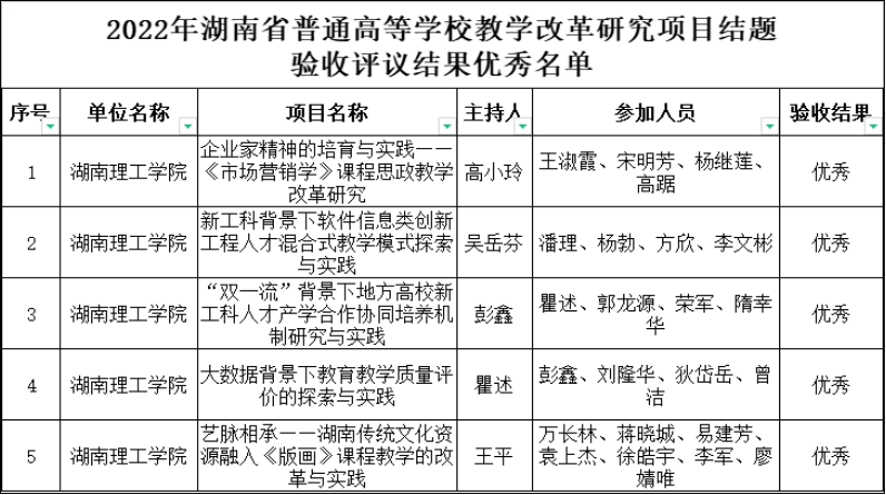热烈祝贺太阳集团tyc33455吴岳芬、彭鑫两位老师主持的省级教学改革研究项目优秀结题!这是近年来我院第4、第5个优秀结题的项目。同一年优秀结题2项,这是太阳集团tyc33455首次。省级教改项目结题优秀比例约15%,该项成绩来之不易。此外,今年还有赵林、谢文武、李志杰、伍建辉、欧先锋等老师主持的省级教改项目顺利结题。各项目主持人及团队成员在项目研究期间,扎实推进教学改革,在提升人才培养质量的探索和实践方面均取得了突出的成效。