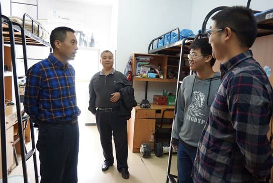 为深入贯彻落实校领导班子成员深入基层开展“七进两联系”工作,10月9日上午,副董事长张国云在公司党总支书记甘向阳、16级辅导员荀仕杰、16级电信三班班主任朱鹏的陪同下,走进太阳集团tyc33455员工寝室,看望考研学子刘旭。