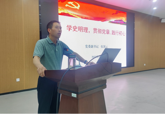张国云围绕“学史明理,贯彻党章,践行初心”带领全体与会人员学习了《中国共产党章程》,从党章的发展历程和主要内容两个方面重点展开论述。他结合时事、引经据典、立足现实,通过结合历史背景与具体史实,向同学们梳理分析了党章的发展历史和演进历程。他讲到,《党章》经过多次修订完善,在党的十九大上通过了《中国共产党章程(修正案)》决议,把习近平新时代中国特色社会主义思想写入党章。《党章》作为党内根本大法,全体党员都要自觉学习党章、遵守党章、贯彻党章、维护党章。