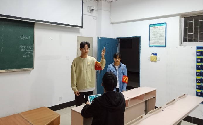 9月22日22:00,在王学鹏老师的带领下两位值班同学徐鹏和张微,对五栋教学楼内尚未关灯的走廊和教室开始清查。从一楼到五楼,在确保楼层无人后,两位同学逐步熄灭走廊和教室的亮灯,偶尔碰见还在教室学习的同学,两位值班同学都会上前小声提醒他们人走灯灭,注意安全。