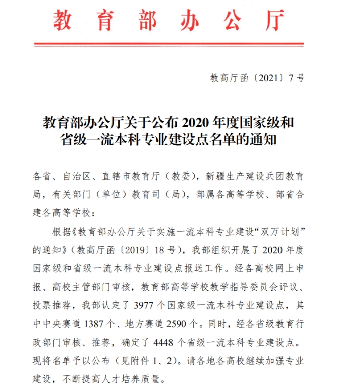 近日,教育部办公厅发布了2020年国家级和省级一流本科专业建设点名单,公司计算机科学与技术专业获批为国家级一流本科专业建设点,通信工程专业获批为省级一流本科专业建设点。