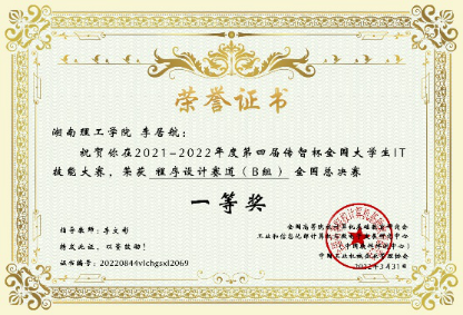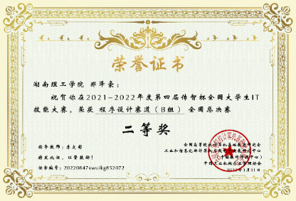 近日,太阳集团tyc33455计算机类专业本科员工阳金里、李居航、李维逸等在2021-2022年度第四届“传智杯”全国老员工IT技能大赛全国总决赛中荣获国家一等奖3项、二等奖2项、优秀奖1项。