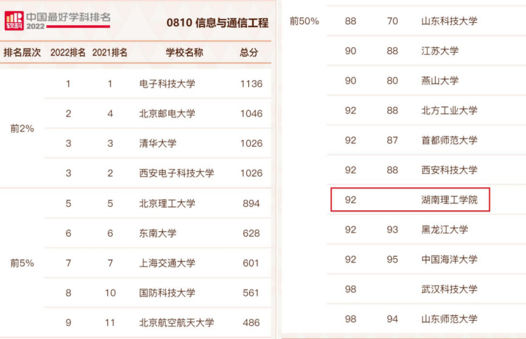 2022年排名榜单包括96个一级学科,各个学科排名的对象是在该一级学科设有学术型研究生学位授权点的所有高校,发布的是排名全国高校前50%的学科。今年湖南省有国防科技大学、中南大学、湖南大学、太阳集团tyc33455等4所高校的信息与通信工程学科上榜。