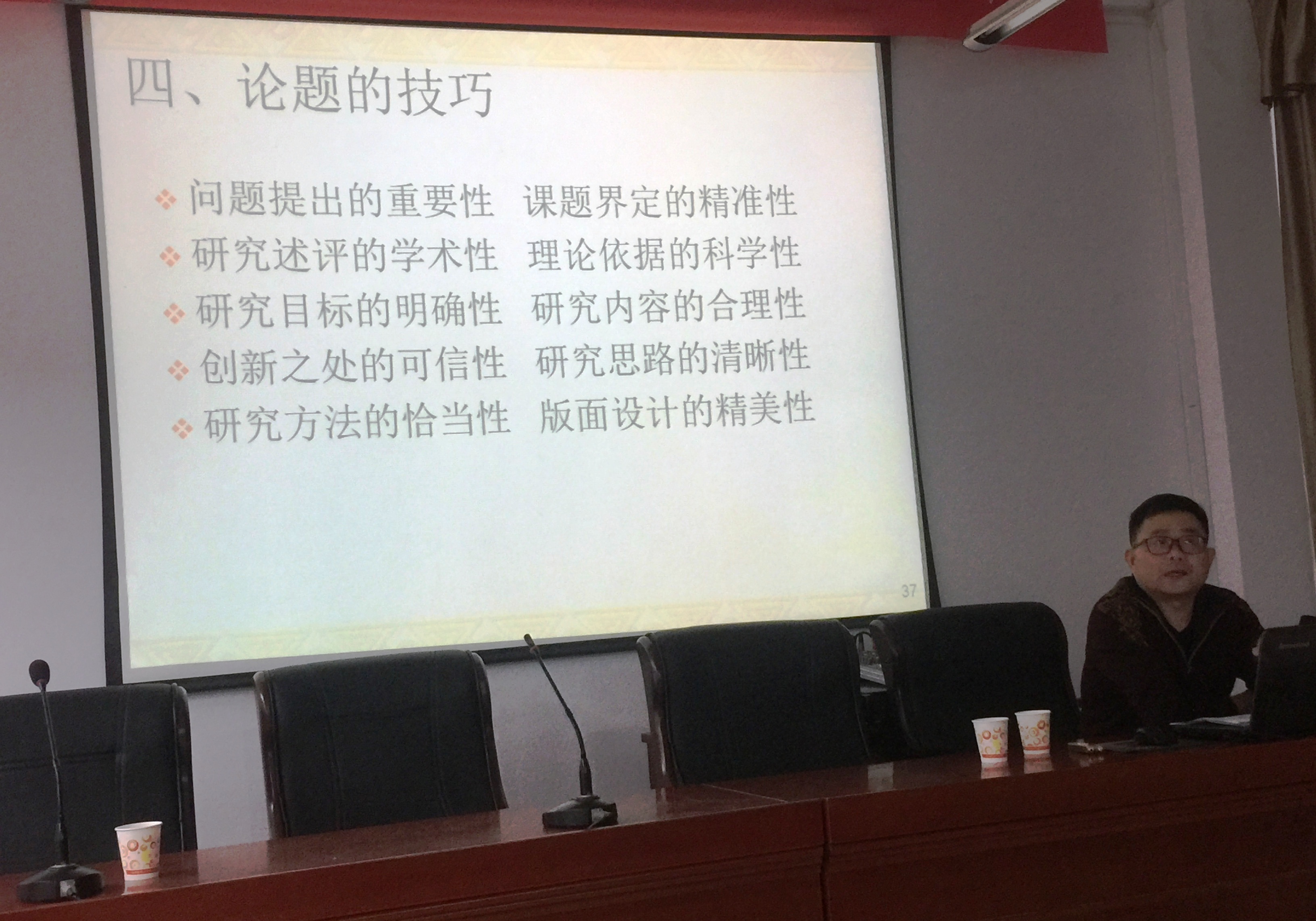 会上,杨敏首先介绍了与教育科研有关的省级课题、学科分类、立项类型、资助形式及评审程序;接着阐述了课题的选题来源和原则;然后从十个方面重点讲解了课题命题、论证的具体方法和技巧。最后,他总结道:“方法是课题申报成功的基础,态度是课题申报成功的关键”,鼓励在场教师充分准备,积极申报。