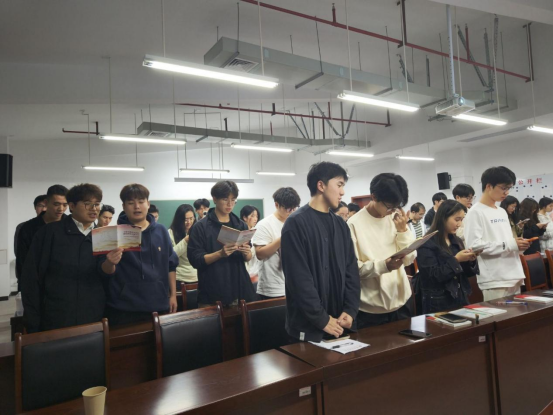 活动现场庄重热烈,党支部书记徐去非、徐壮以及全体入党积极分子以饱满真挚的情感、铿锵有力的语调,诠释对祖国的眷恋与礼赞,将对祖国历史的敬畏、当下发展的自豪与未来征程的憧憬融入字里行间。朗朗书声萦绕教室,让入党积极分子在沉浸式体验中深化了对爱国主义精神的理解,坚定了向党组织靠拢的信念。