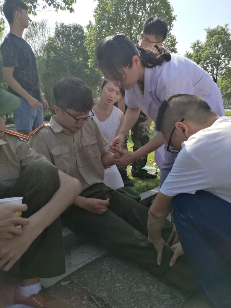 通信二班凌均泽同学,军训过程中突感不适,党总支张泰来书记、班主任徐丹老师迅速赶到现场看望员工,辅导员周煊阳老师及时请来医务人员为其治疗。路过的两位热心学长见状,也立刻帮忙为他按摩,缓解痉挛症状。随后,凌均泽被送往医院,经检查无大碍。下午,凌均泽同学仍选择继续训练。