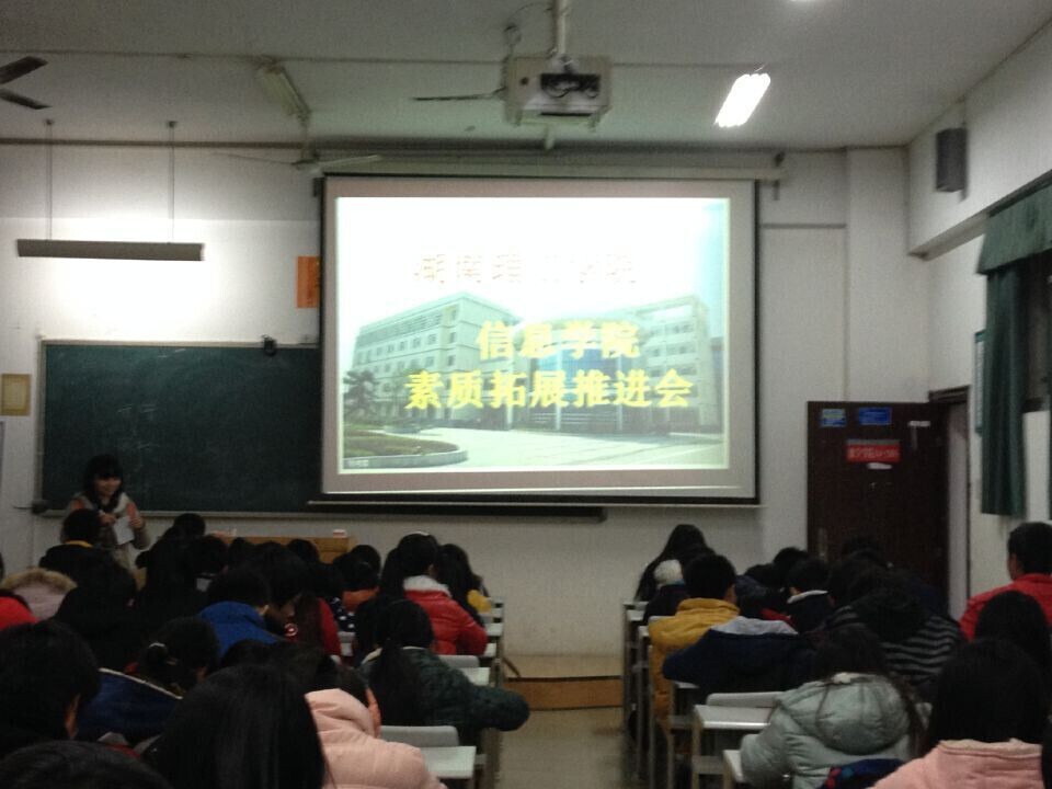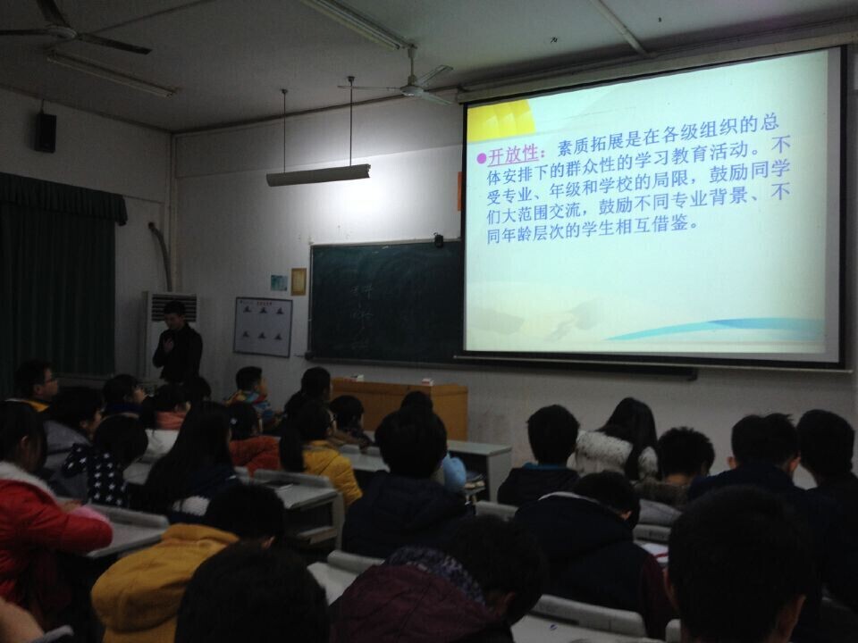会议的主要目的是让14级新生充分了解素质拓展的意义及其重要性。首先素拓部干事王文兴播放了第一组幻灯片阐述素质拓展计划的背景,介绍了素质拓展的四个性质,即“开放性”、“全面性”、“多样性”和“柔性”。接下来采用大量的图片事实(包含老员工素质拓展计划的实施)展示了素质拓展的意义、素质拓展认证及其相关证书和《老员工素质拓展证书》的作用。王文兴声情并茂的演讲赢得会场一阵又一阵的掌声。