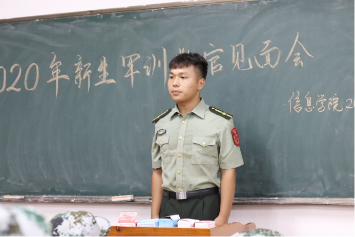 见面会前,各连教官在走廊集结,院领导和教官们简单交流后,便有序进入相应教室指导工作。20级新生用三声响亮的 “教官好!”迎接教官。教官们进行了自我介绍并向新生们提出军训纪律要求,要求做到“着装齐,精神旺,纪律好,听指挥,爱团结”,教官表示军训是一个磨练意志的过程,也将会是新生在大学上的第一堂课,所以他们希望在军训期间,新生们能以一种全新的精神面貌来迎接。