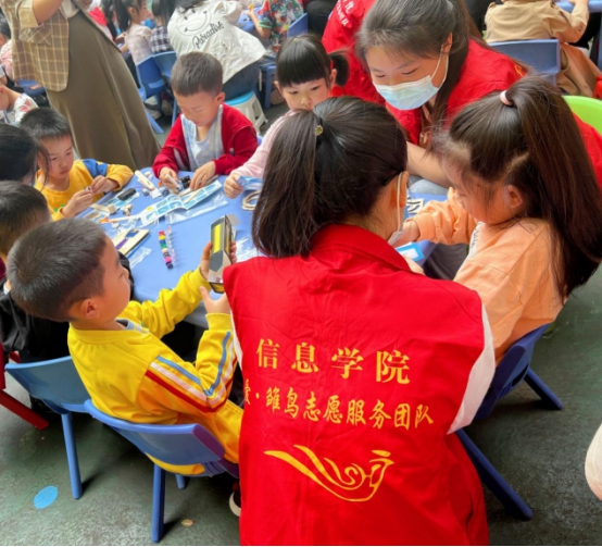 志愿者们提前到达公司路幼儿园准备手工材料、布置会场。小朋友们发挥想象,和志愿者们相互配合,分工协作轻松完成了各种各样新奇的手工玩具。