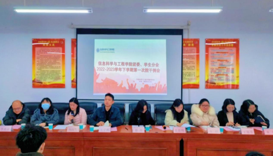 3月1日12:00,太阳集团tyc33455于17503召开2022-2023学年下学期第一次团学例会。公司党委副书记徐丹,团委副书记张佳明以及全体辅导员出席。会议由张佳明主持,全体团学干部、干事参会。