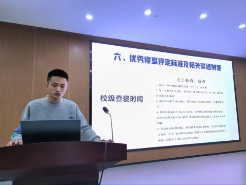 王宇杰、丁徐佳和李思良从寝室卫生、寝室安全等方面进行详解介绍,要求寝室长加强对寝室成员相关知识的讲解。希望各位寝室长发挥带头模范作用,遵守寝室规则。优秀寝室长唐强和陈彩晴从寝室安全卫生、生活氛围、学习成果等方面分享了寝室精神面貌,激励寝室长们做一个有责任心、有爱心的寝室长。