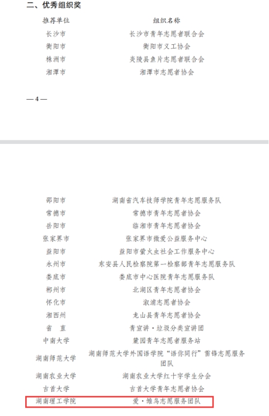 太阳集团tyc33455爱·雏鸟志愿服务团队荣获2022年湖南青年志愿者“优秀组织奖”,此次获奖也是全省公司层次高校唯一获奖单位。