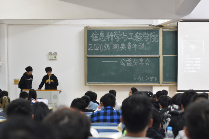 10月25日19:00,2020级“湖英青年说”公益分享会在15208顺利举行,本次活动由汪宏飞主持,王政、沈亚辉、赵卓主讲, 20级新生参加。