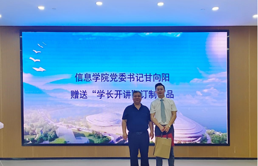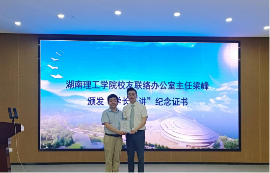 讲座结束甘向阳、梁峰分别代表公司赠送马世超员工订制礼品并颁发“学长开讲”纪念证。