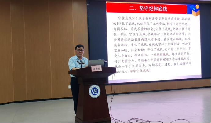 谢贵辉强调,不管是当下教师还是员工毕业任职后都必须遵守党规党纪。他结合实际案例,深入浅出地讲解了党纪的内涵和要求,以及违反党纪的严重后果。他要求全体党员要时刻绷紧纪律之弦,严格遵守党的政治纪律、组织纪律、廉洁纪律、群众纪律、工作纪律和生活纪律,做到心有所畏、言有所戒、行有所止。